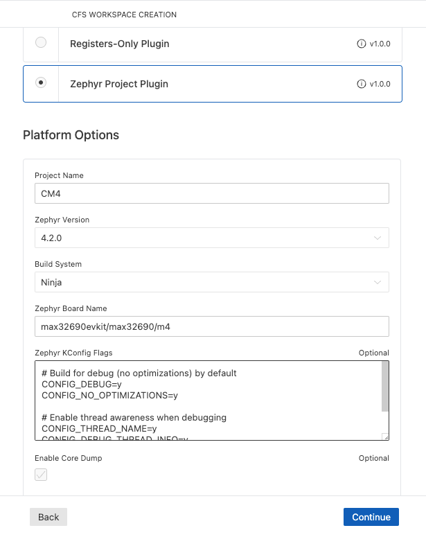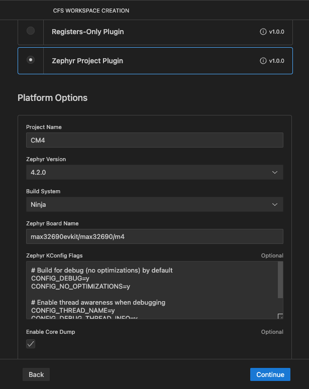 Core dump support can be enabled during workspace creation in CodeFusion Studio.